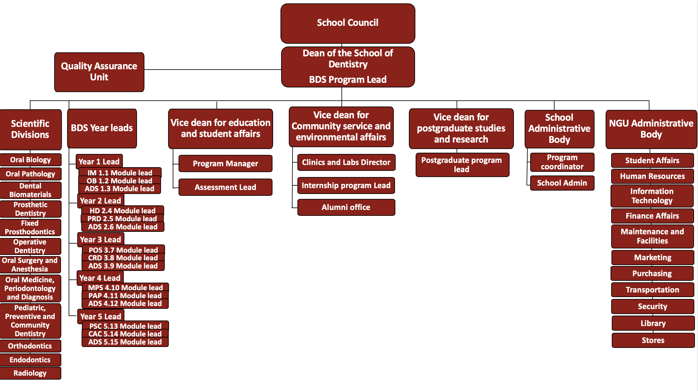 The role of the Quality Assurance Unit (QAU) is to support a culture of total quality management across the School of Dentistry at NGU; to ensure that standards and guidelines within the teaching, learning and assessment processes for NGU’s undergraduate dental program are implemented; ensure that good practice is recognized and rewarded, and that any deficiencies that impact on the delivery of a high-quality program are rapidly identified and managed.