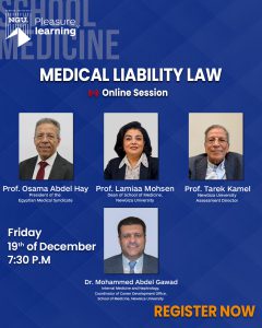 The Career Development Office (CDO) at the School of Medicine, Newgiza University, organized an online seminar on the Medical Liability Law, discussing its key provisions, implementation challenges, and impact on daily medical practice.