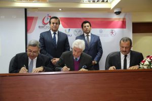 During the press conference, Dr. Khaled Abdul Ghaffar, and Dr. Sobhi witnessed the signing ceremony of a cooperation protocol between the Egyptian Sports Federation for Universities, the Egyptian Squash Federation, and Newgiza University, for organizing the 2022 World Squash Championship in Egypt. The tournament will be held on seven courts in Newgiza University, with the final match to be held by the pyramids.