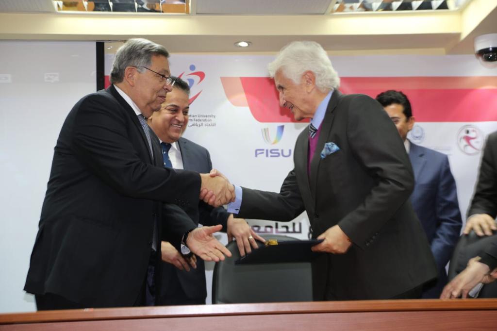The conference was held at the premises of Ministry of Higher Education and Scientific Research in the presence of Dr. Ayman Ashour, Deputy Minister for Universities Affairs, Dr. Sobhy Hassanein, Vice President of the Egyptian Federation of Universities, and Captain Ahmed Shoubir, Chairman of the Media Committee of the University Sports Federation, and Dr. Hisham Al-Jayoushi, Secretary of the Egyptian Federation of Universities, and Dr. Ismail Abdel Ghaffar, President of the Arab Academy for Science and Technology, Mr. Hisham Nasr, President of the Egyptian Handball Federation, and Ehab Hafez, Member of the Board of Directors of the Egyptian Squash Federation, Dr. Adel Abdel Ghaffar, Media Advisor and Official Spokesperson for the Ministry of Higher Education.