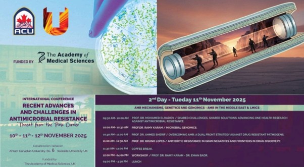 Ahmed Sherif (Professor of Microbiology and Immunology) participated in the international conference titled “Recent Advances and Challenges in Antimicrobial Resistance: Threat From The Pink Corner“, organized by the Faculty of Pharmacy at Ahram Canadian University, in collaboration with Teesside University – UK, and funded by The Academy of Medical Sciences – UK under the Networking Grant.