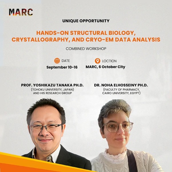 Many thanks to Professor Rami Karam Aziz (Head of the Research Laboratories in Life Sciences – MARC Research Center) for providing the opportunity to train two of the SOP TAs (Noha Mustafa Abdelhamid and Yara Ahmed Zaki) by participating in the training workshop titled “Hands-on Structural Biology, Crystallography, and Cryo-EM Data Analysis” held at the MARC Research Center in 6th of October City from Wednesday to Tuesday, September 10 to 16, 2025, especially considering that the available opportunities were extremely limited (a total of only 6 seats).